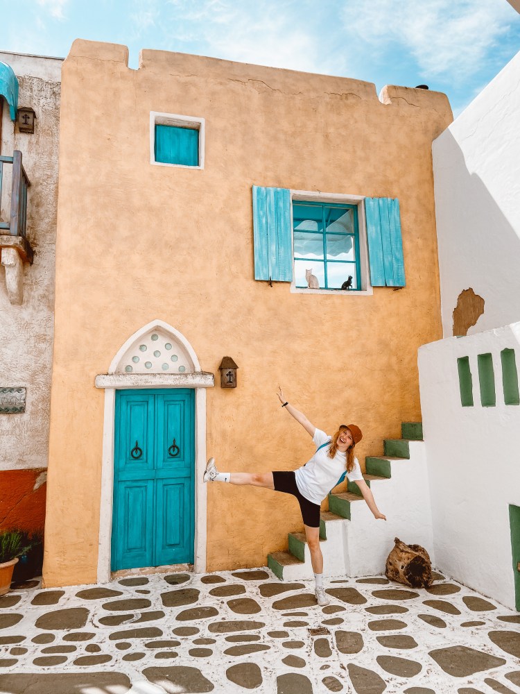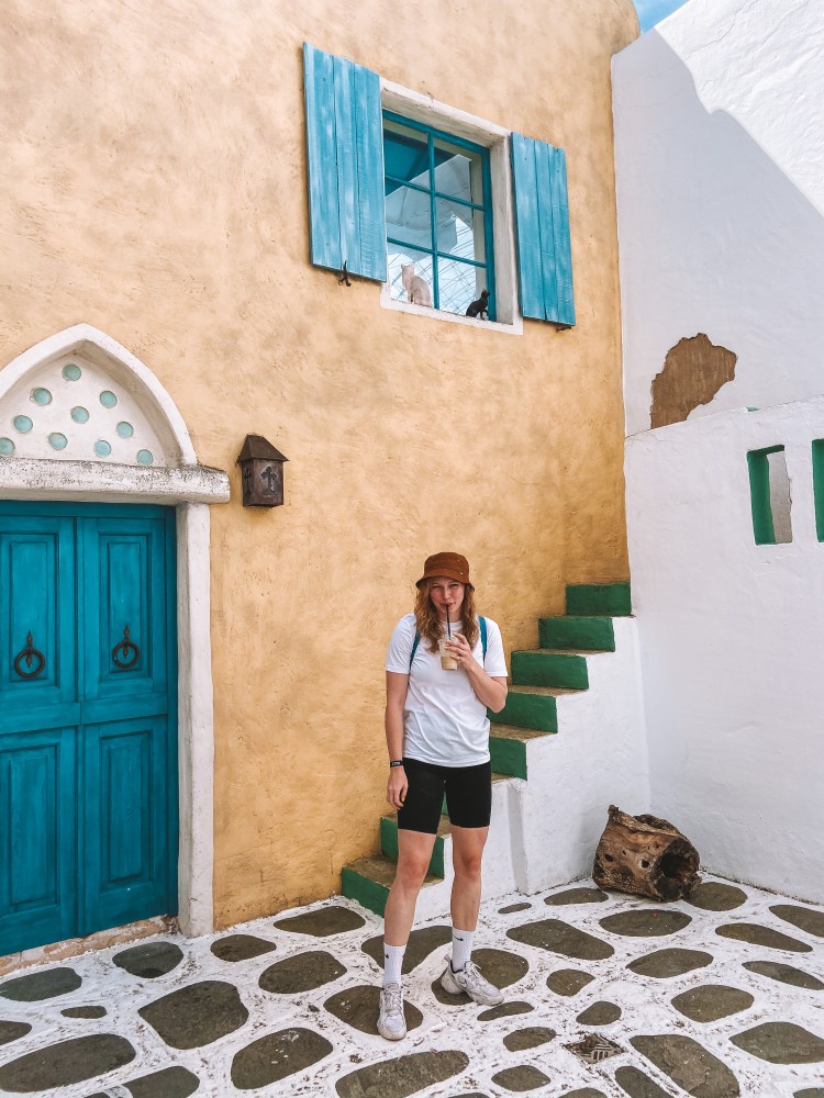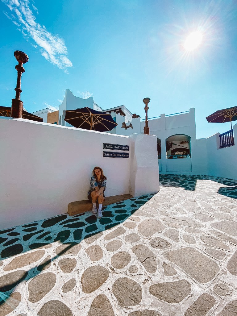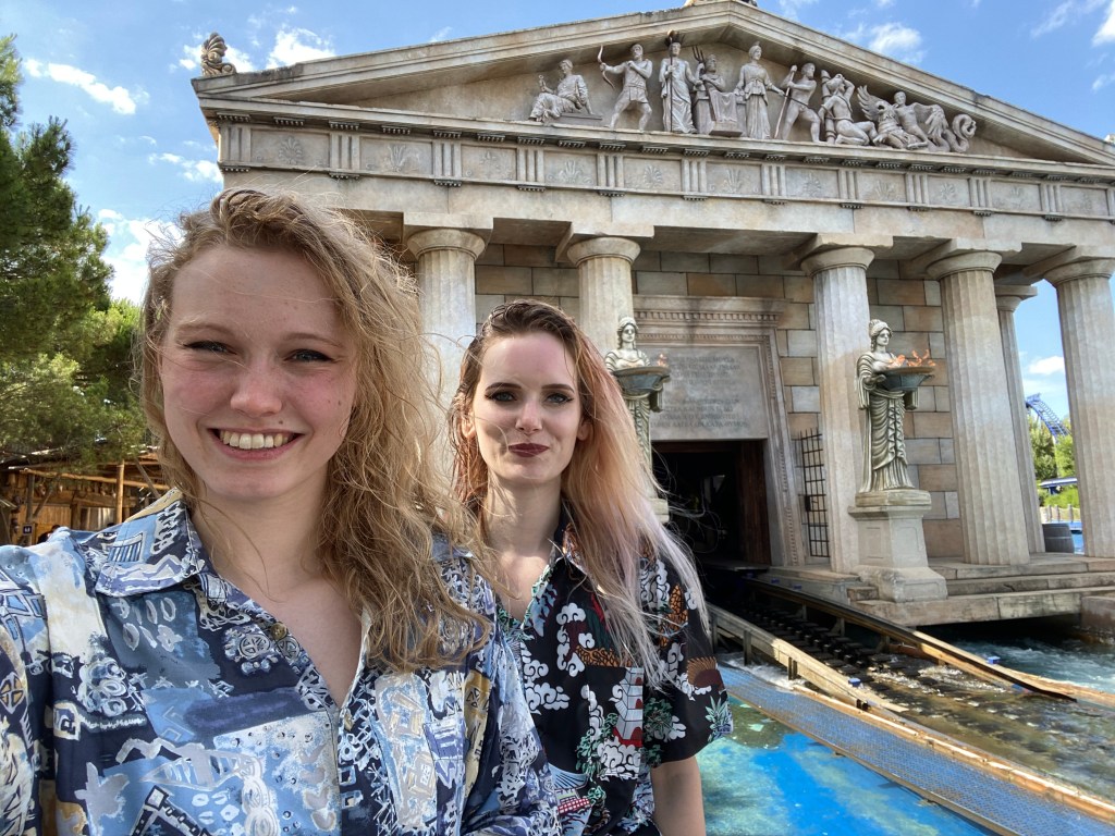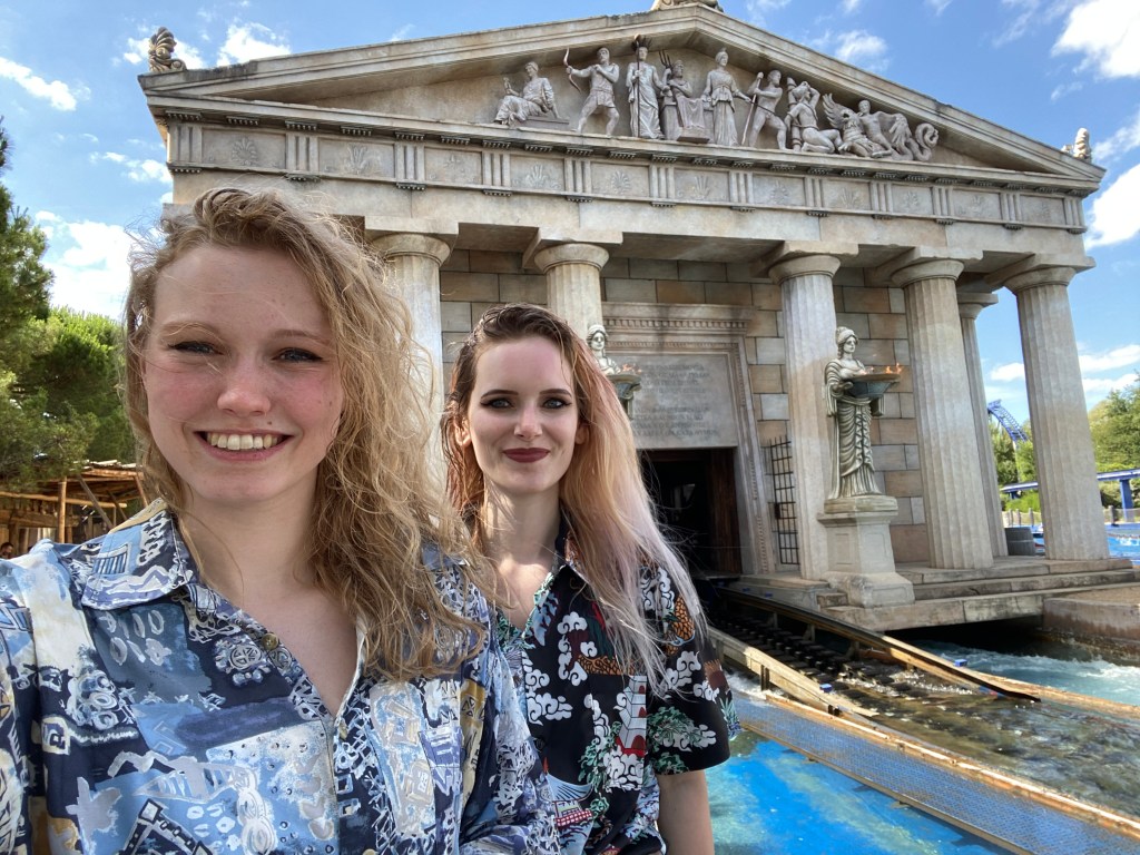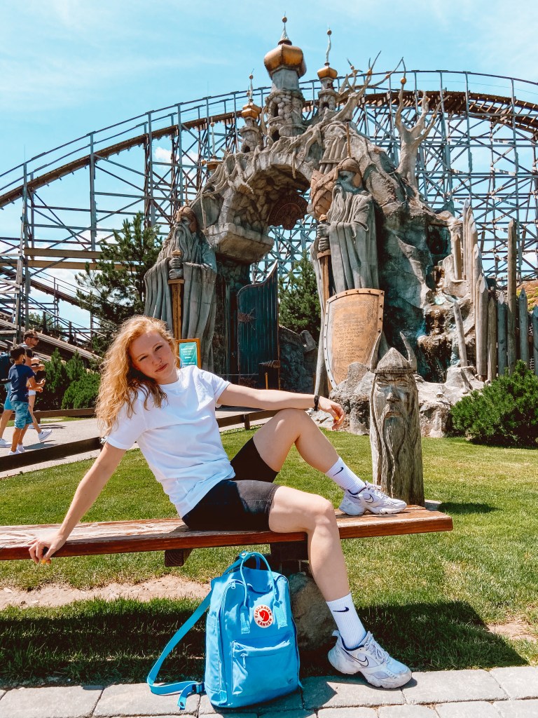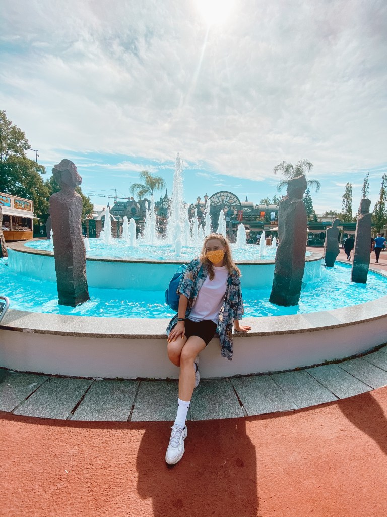 ‘Silverstar’ is 73 meters high and gains speed up to 130km/h. The whole ride lasts 3 minutes, which makes even better! The ride itself was great as usual. Great adrenaline rush and felt freeing to be so high up. The rush is what I love most about rollercoasters. Shortly after the ride I decided to treat myself with an Iced Frappuccino while we walked to ‘Greece’. If you have never been to EuropaPark, it is divided by different European countries such as Germany, France, England, Iceland and many more. Once arrived in Greece, we let out our influencer and decided to have a little photoshoot, making it look like we were on a super nice holiday (don’t get me wrong I’d much rather be in actual Mykonos or Athens). Here are some snapshots from Greece.