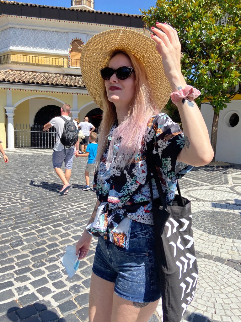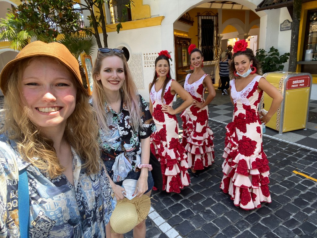 Having the burning sun constantly on our heads, we made a little journey through other countries to try and find a hat for Christine, which brought us to Spain. Here is usually the main part for the big show of Roman stage fighting, which unfortunately is still closed. We did find a hat and we took a cute selfie with Flamenco dancers, which walked around with the disinfectant spray.